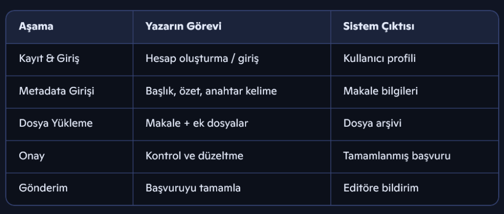 OJS’de makale başvurusu genellikle 5 aşamadan oluşur: